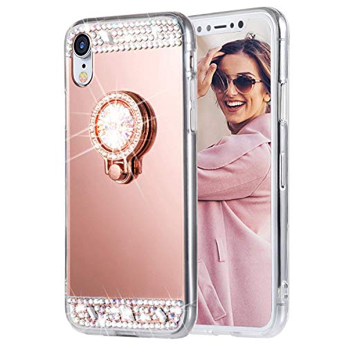 Caka iPhone XR Case, iPhone XR Glitter Case [Mirror Series] Bling Luxury Cute Shiny Mirror Makeup Protective TPU Case for Girls with Ring Kickstand Diamond Crystal for iPhone XR – (Rose Gold)