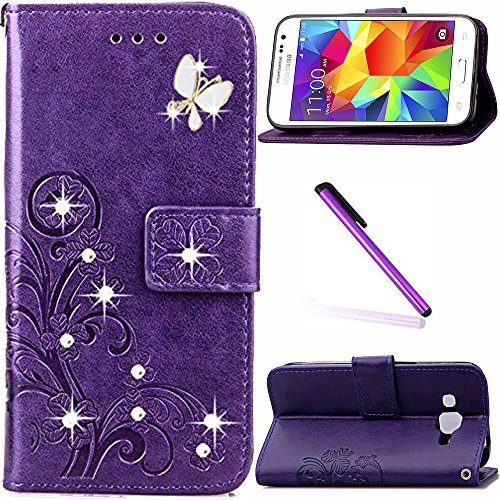 G360 Case,Galaxy Core Prime Case,LEECOCO Bling Crystal Diamonds Lucky Clover Floral with Card Slots Flip Stand PU Leather Wallet Case for Samsung Galaxy Core Prime G360 Diamond Clover Purple