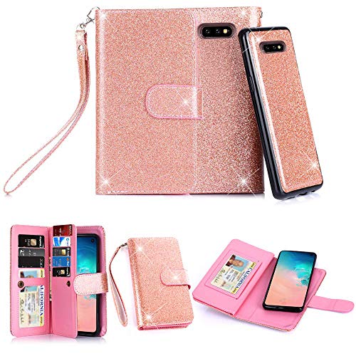 Galaxy S10e Case, 10 Card Slot – ID Slot, Button Phone Wallet Cover Folio PU Leather Case Cover with Detachable Magnetic Hard Case – Glitter Rose Gold