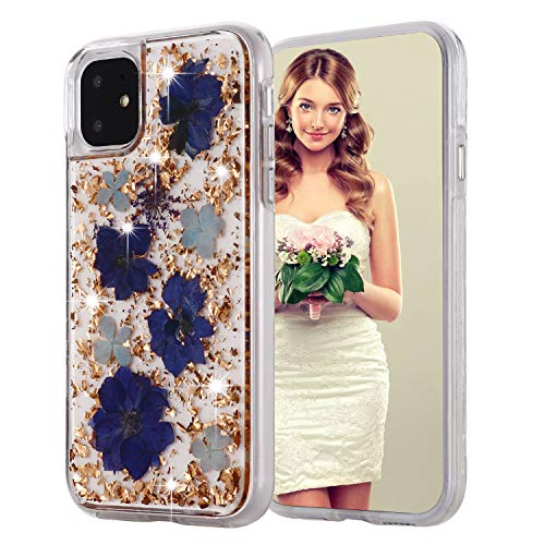 iPhone 11 Case, Inkomo Women Luxury Fashion Natural Flower Glitter Foil Sparkle Hard Back Cover with Clear TPU Bumper Protective Phone Bling Case for Apple iPhone 11 6.1” 2019 (Purple Flower)