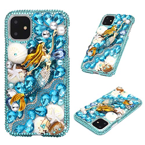 iPhone 11 Case – Mavis’s Diary 3D Handmade Luxury Bling Crystal Diamonds Blue Fancy Mermaid with Starfish Shells Pearls Shiny Glitter Sparkly Rhinestone Clear Hard PC Case Cover