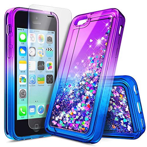 iPhone 5C Case with Screen Protector HD Clear for Girls Kids Women, NageBee Glitter Liquid Quicksand Waterfall Floating Flowing Sparkle Shiny Bling Diamond Cute Case for iPhone 5C -Purple/Blue