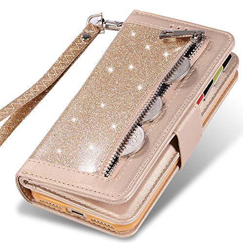iPhone 7 Plus Card Holder Case,iPhone 8 Plus Wallet Case,Kudex Bling Glitter Flip Leather Zipper Money Pocket Magnetic Purse Case [Kickstand] with 9 Cards Holder&Strap for iPhone 7Plus / 8Plus