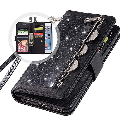 iPhone 8 Bling Wallet Case for Women,Auker Trifold 9 Card Holder Folio Flip Glitter Leather Folding Stand Magnetic Wallet Purse Case with Strap&Zipper Coin Change Money Pocket for iPhone 7 (Black)