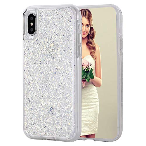 - [Fashionable Shinning Glitter Shells Design]: Cute shiny glitter design on the back will make your iPhone more attractive and fashionable. Brightly color with shinning elements on the back, bing bling shinning, so the case is smooth and doesn’t chip or peel easily; The clear bumper on the sides will show off the color of your phone’s.