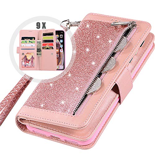 iPhone XR Bling Wallet Case with Strap for Women,Auker 9 Card Holder Folio Flip Glitter Leather Zipper Wallet Case w/Fold Stand&Money Pocket Sparkly Full Protective Purse Case for iPhone XR (RoGold)