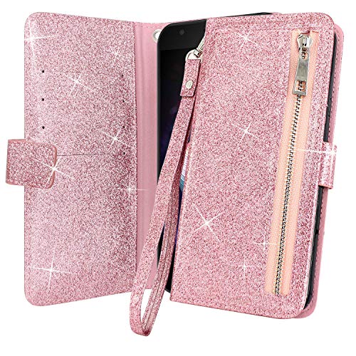 LG K10 2018 Case, LG K30 Case, Harryshell Kickstand Flip PU Wallet Leather Protective Case Cover with Card Slots Wrist Strap for LG Harmony 2 / Premier Pro LTE / K30 (X410) (Zipper Bling Pink)