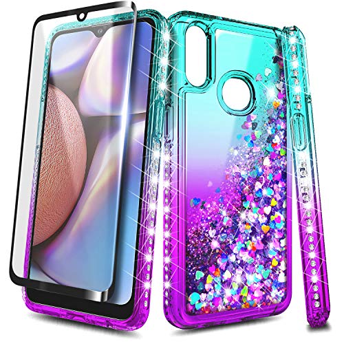 NageBee Case for Samsung Galaxy A10S with Tempered Glass Screen Protector (Full Coverage), Glitter Liquid Bling Floating Waterfall Durable Girls Women Kids Cute Case (Not Fit A10/A10E) -Aqua/Purple