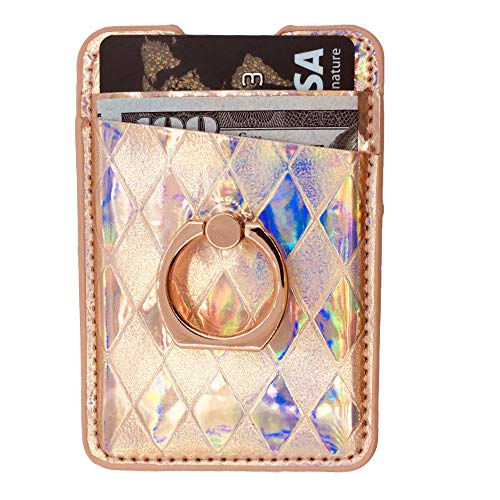 Phone Card Holder with Finger Ring PU Leather Credit Card Wallet RFID Blocking Pocket ID Case Pouch 3M Adhesive Sleeves Sticker Grip Kickstand with Android and All Smartphones (Rose Gold)