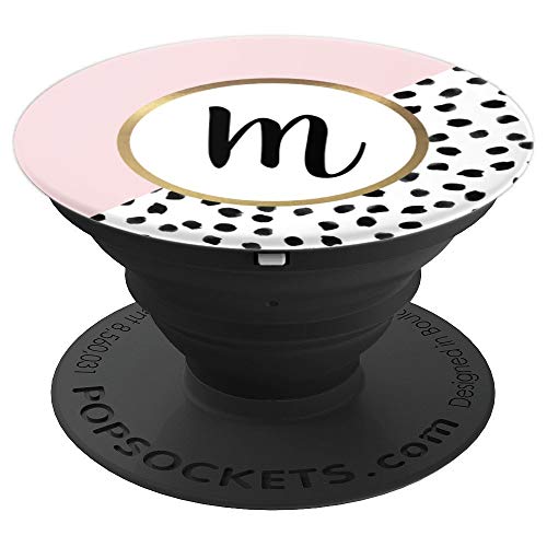 - M Initial M Letter M monogram with a monogrammed M on a black and white dots abstract animal print inspired painted brush strokes polka dot pattern. A girly pastel light pink / blush diagonal gives an elegant sophisticated stylish glam look.