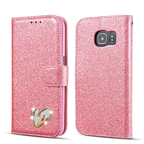 QLTYPRI Samsung Galaxy S7 Edge Glitter Case, Wallet Case Premium Glitter PU Leather TPU Bumper Card Holder [Wrist Strap] Inlaid Loving Heart Diamond Flip Cover for Samsung Galaxy S7 Edge – Pink