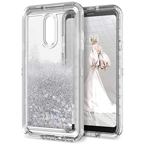 Dexnor Compatible with LG Stylo 4 Case LG Q Stylus Case Hard Clear Glitter 3D Flowing Liquid Cover TPU Silicone + PC 3 Layer Shockproof Protective Heavy Duty Defender Bumper for Girls/Women – Silver