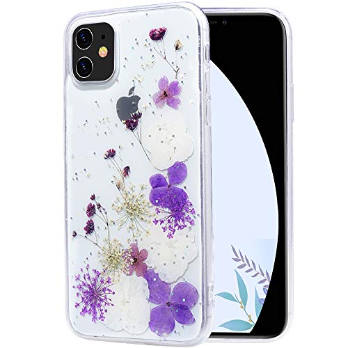 Flocute Bling Case for iPhone 11 Glitter Floral Case Real Flower Luxury Girly Sparkle Starry Slim Flexible Lightweight Soft Gel TPU Protective Case (Purple White Flower)