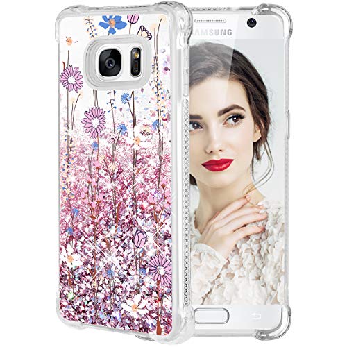 Galaxy S7 Case, Caka Galaxy S7 Floral Glitter Case [Flower Pattern Series] Luxury Fashion Bling Flowing Liquid Floating Sparkle Glitter Girly Soft TPU Case for Samsung Galaxy S7 – (Pink Flower)