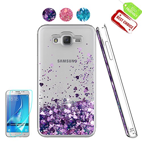 J7 Case,Galaxy J7 Case with HD Screen Protector for Girl,Atump[Love Heart Series] Liquid Glitter Bling Sparkly Soft TPU Bumper Clear Quicksand Cases Woman Gift Cover for Samsung J7 J700 2015 Purple