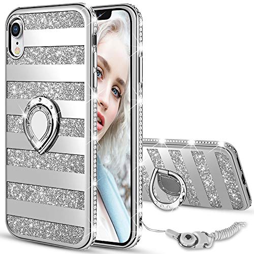 Maxdara Case for iPhone XR Glitter Case Ring Grip Kickstand Holder Bling Sparkle Diamond Rhinestone Bumper Mirror Reflex Striped Luxury Pretty Fashion Girls Women Case XR 6.1 inch (Sliver)