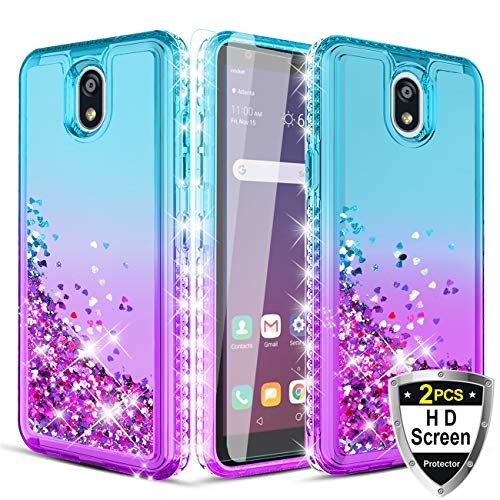 Wallme for LG Escape Plus Case,LG K30 2019/Arena 2/Journey LTE/Tribute Royal Case with HD Screen Protector[2 Pack],Glitter Diamond Hearts Falling,Durable TPU Phone Case for Girls Women-Teal/Purple