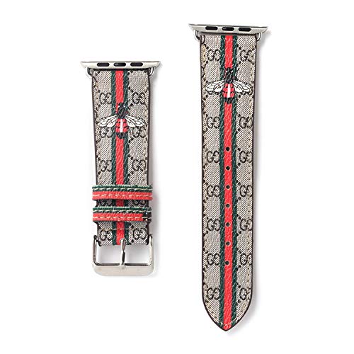 42/44MM Compatible Apple Watch Straps, Luxury Fashion Monogram PU Leather Classic Wrist Bands for Women and Men, Replacement for Apple Watch Series 4 3 2 1 42mm (fit for 44mm) (Stripe Lovely Bee)