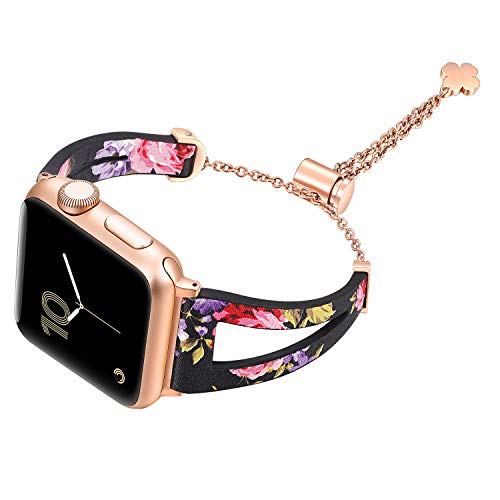 fastgo Leather Bracelet Compatible with Apple Watch Bands 38mm 40mm 42mm 44mm, Cuff Bangle for Iwatch Series 4/3/2/1, Thin Breathable Wristbands Women Girls Adjustable  (Black/Pink Flower, 42mm 44mm)