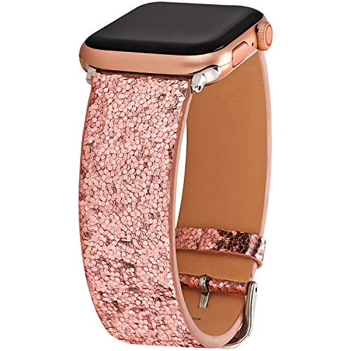 Glittery Watch strap: This Rose gold watch glitter band’s outer layer is crafted in 3D shiny glitter PU which makes your watch looks fashion cute and elegant,bling bling look, makes your watch modern,sparkle and different from others’.The inner layer is made of smooth genuine leather,soft and comfortable to wear.The glitter is not easy to fall off for normal usage.
