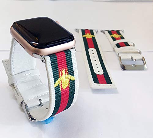 - [Add fashion designs]Beautiful replacement bands for Apple Watch Series 4 and Series 3 and Series 2 and Series 1,the band surface is a mixed design of Woven nylon,High performance woven nylon finished by fashional craftsmanship and embroidery(Please pay attention to the golden honeybee), And inner side is genuine leather which comfort for your wrist.