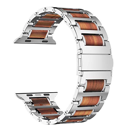 iiteeology Compatible with Apple Watch Band 44mm 42mm, Natural Wooden Red Sandalwood Stainless Steel Link Bracelet Strap for Apple iWatch Series 5/4/3/2/1 – Silver