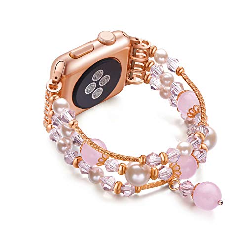 JuQBanke Compatible for Apple Watch Band 38mm 40mm, Jewelry Fashion Stretch Crystal Pearl Bracelet Replacement Womens Strap, Compatible for iWatch Series 4/3/2/1(Rose Gold, M/L)