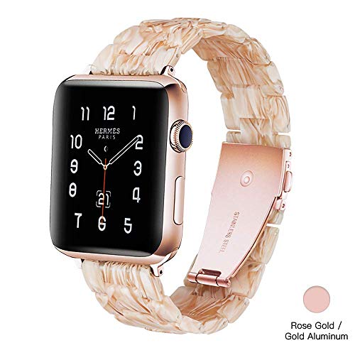 APPLICATION: Compatible with all 38mm(40mm) 42mm(44mm) iWatch Apple Watch, includig Series 4, Series 3, Series 2, Series 1, Sport, Hermes, Nike+, Edition, etc. Fit for all wrists smaller than 8.7”, this almost covers all wrist sizes, no matter smallDazzling design: The design of this strap is very dazzling and stylish, it will attract the attention of others. Comfortable to wear, pleasing to the eye, it is absolutely addictive. Water resistant: in general-suitable for wash hands; swimming and snorkeling, but not scuba diving. Luxury, nobility, elegance and durability style enough for work and stylish enough for a traveling. HAND POLISHED&SUPERB MATERIALS: Each piece of resin is slowly polished by the experienced artificers. Combined with premium tortoise-tone Resin and 316L stainless steel fold-over clasp with double push button safety closure, it offers a new bracelet look to your Apple watch. Lighter than stainless steel metal band. Extreme Lightness makes it very comfortable to wear, and besides skin-friendly. 12 Months No-hassle Warranty. Accept return if you are not satisfied with the quality. Please feel easy to order it. Package Including: 1x Watch Band. 1 x links removal tool. 1 x links removal Instruction(smart watch is not included).