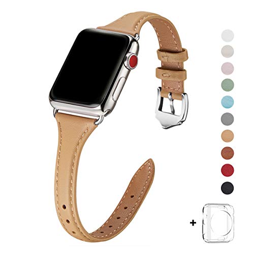 WFEAGL Leather Bands Compatible with Apple Watch 38mm 40mm 42mm 44mm, Top Grain Leather Band Slim & Thin Replacement Wristband for iWatch Series 5 & Series 4/3/2/1(Camel Band+Silver Adapter,38mm 40mm)