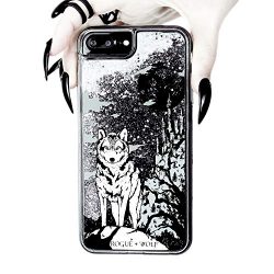 A Magical Phone Case featuring a Lone White Wolf and an enchanted Castle beyond the mountains, with a liquid glitter background to create the feel of a cold glistening