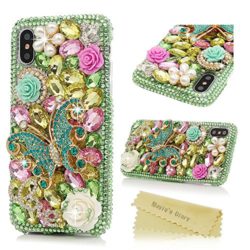 iPhone X Case, iPhone Xs Case, Mavis’s Diary Full Edge Protective Plastic Case, 3D Handmade Crystal Clear Bling Green Diamonds Shiny Colorful Rhinestone Floral Butterfly Pearl Hard PC Cover