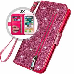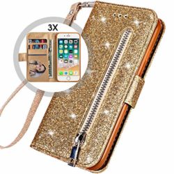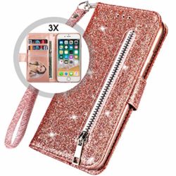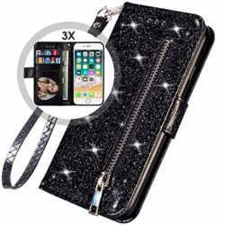 iPhone 8 Bling Wallet Case for Women,Auker Trifold 9 Card Holder Folio Flip Glitter Leather Folding Stand Magnetic Wallet Purse Case with Strap&Zipper Coin Change Money Pocket for iPhone