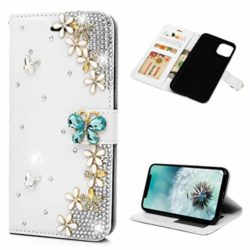 iPhone 11 Pro Max Case, Premium PU Leather Flip Protective Cover Handmade Bling Diamonds White Flower Blue Butterfly Buckle Wallet Case [Folio Style][Stand Feature] Card Case by Mavis’s Diary