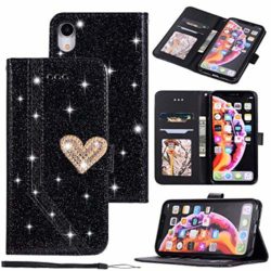 WIUSUN Bling Wallet Case for iPhone XR, Glitter Magnetic Flip PU Leather Cover [Card Slots][Kickstand] Diamond Buckle Soft TPU Protective Case for iPhone XR (Black)