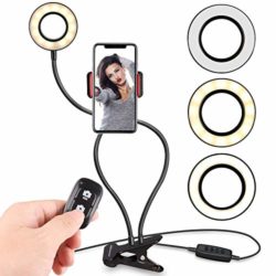 UBeesize professional halo ring light with cell phone holder for selfie photo and live videos Features: Hand Free – clamp on table/desk/bed and rotate any angle to free your